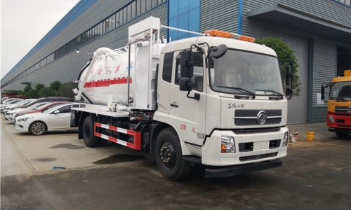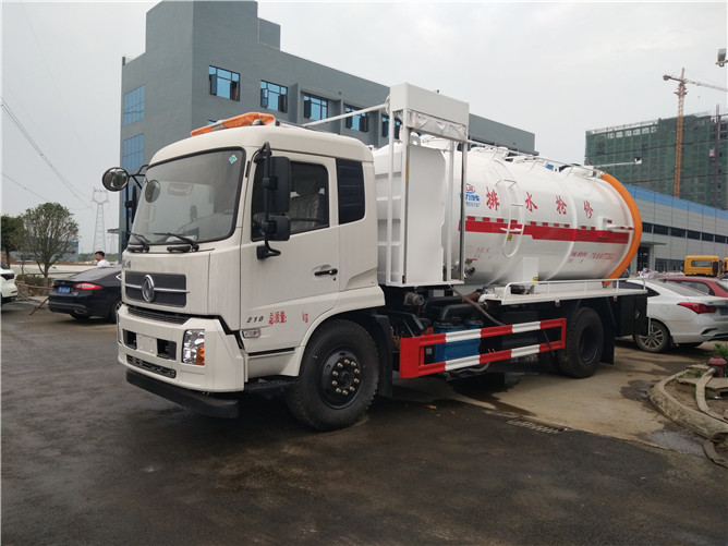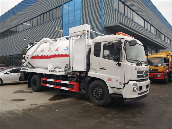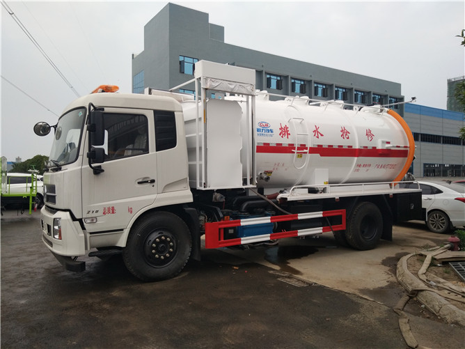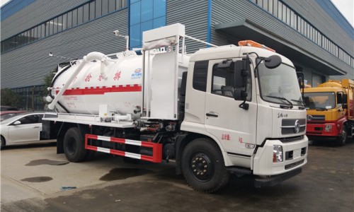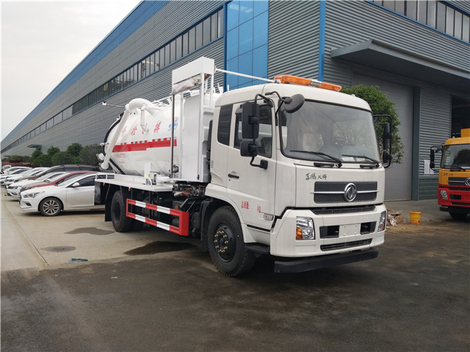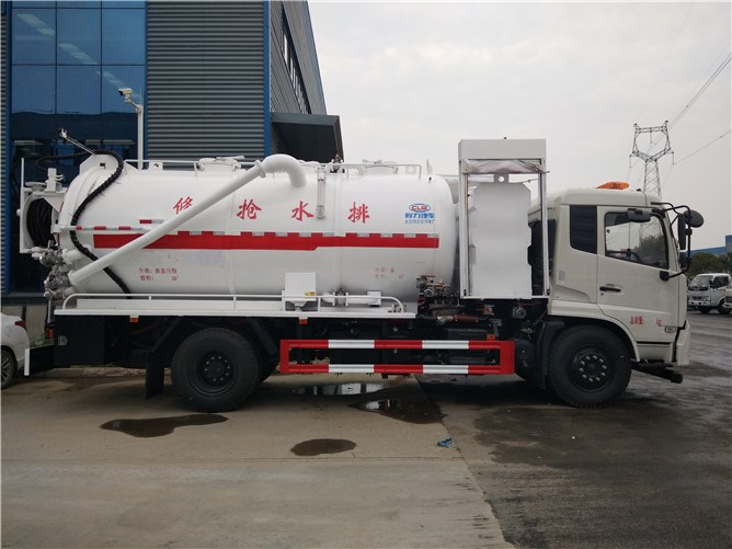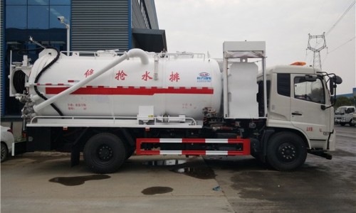 11立方東風天錦吸污車罐體采用優質碳鋼制作,筒體5mm,封頭6mm,配億豐真空油泵,真空壓力表,視污窗,帶水油分離器,防溢閥。罐體尾部一般配DN100球閥,且后蓋可通過液壓裝置打開,配6米長吸污管。