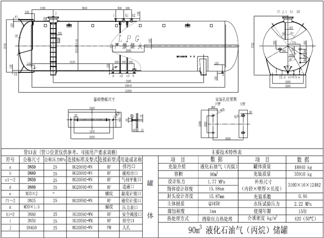 90立方液化氣儲罐一般多設計成直徑3100mm,設計壓力為1.77MPa,封頭為橢圓形,主體材料為壓力容器產品專用鋼板——容器板Q345R,罐體上鞍座和接管的位置可按用戶的要求進行調整,以下為大眾的90方規格參數,供大家參考。