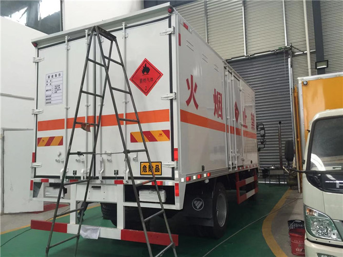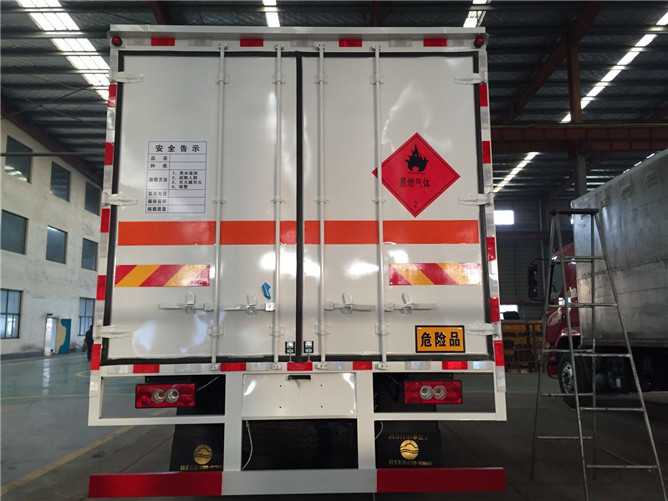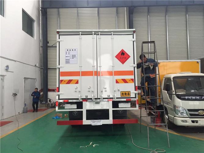 氣瓶運輸車必須采用危險品運輸專用底盤,排氣管前置,廂體內部安裝有易燃氣體泄漏報警器,廂體外表面貼有防爆標識,可以提醒大家注意與危險品運輸車輛保持安全間距。