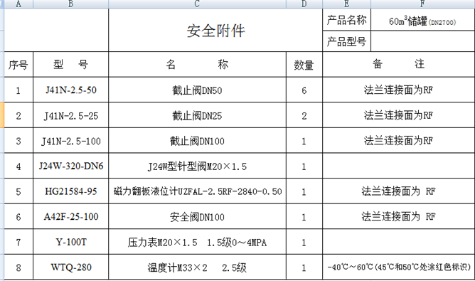 由清單可以看出,液氨儲罐安全附件跟罐體上的罐口是密切相關的,液相若改用DN80的,截止閥就會隨之改變,因此用戶朋友們在購買時一定要按照你的圖紙來,避免弄錯。