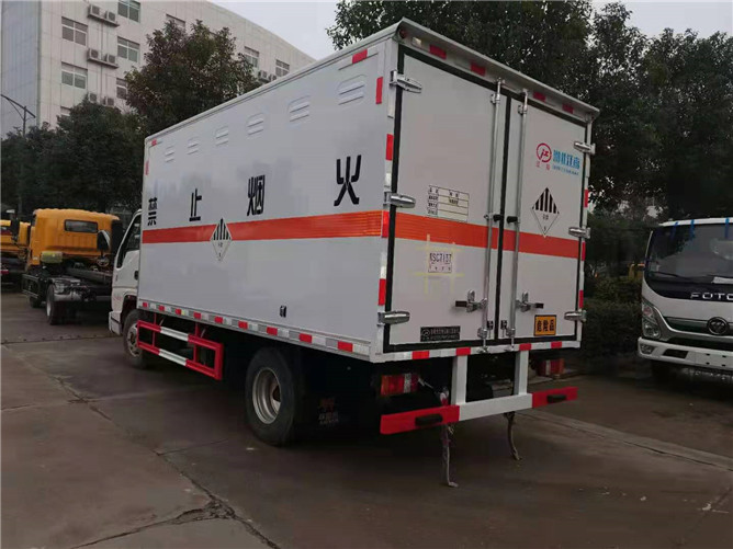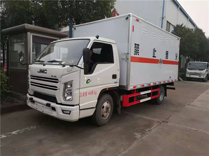 此款危險品廂式車搭載江鈴115馬力發動機,駕駛室是單排,可向前翻轉,帶方向助力,五檔手動變速箱,油剎,電動車窗,中控遙控鎖,排氣管前置,前盤碟剎,帶爆胎應急裝置,剎車襯片報警,前橋2噸,后橋3.5噸。